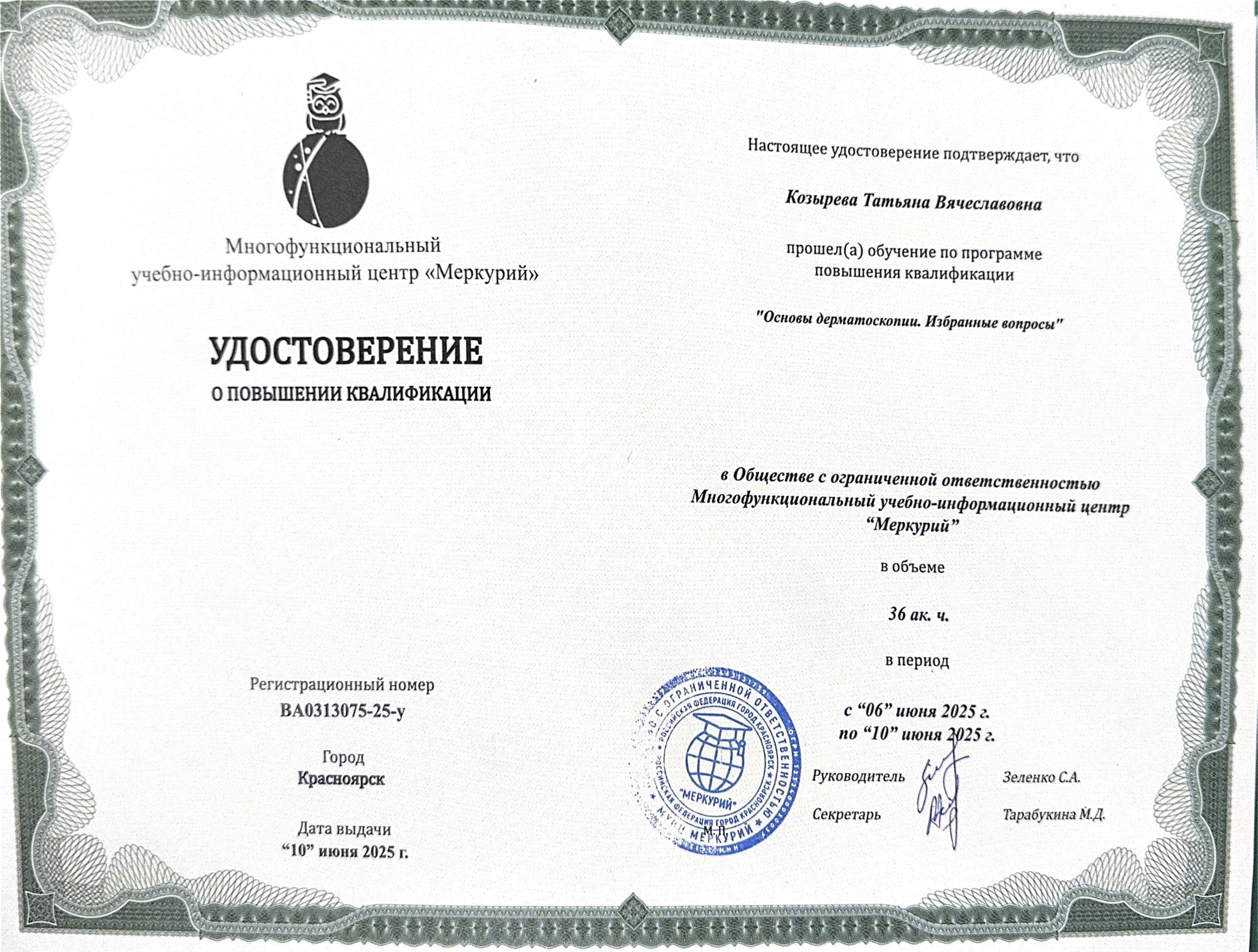 Повышение квалификацииМногофункциональный учебно-информационный центр "Меркурий". "Основы дерматоскопии. Избранные вопросы"