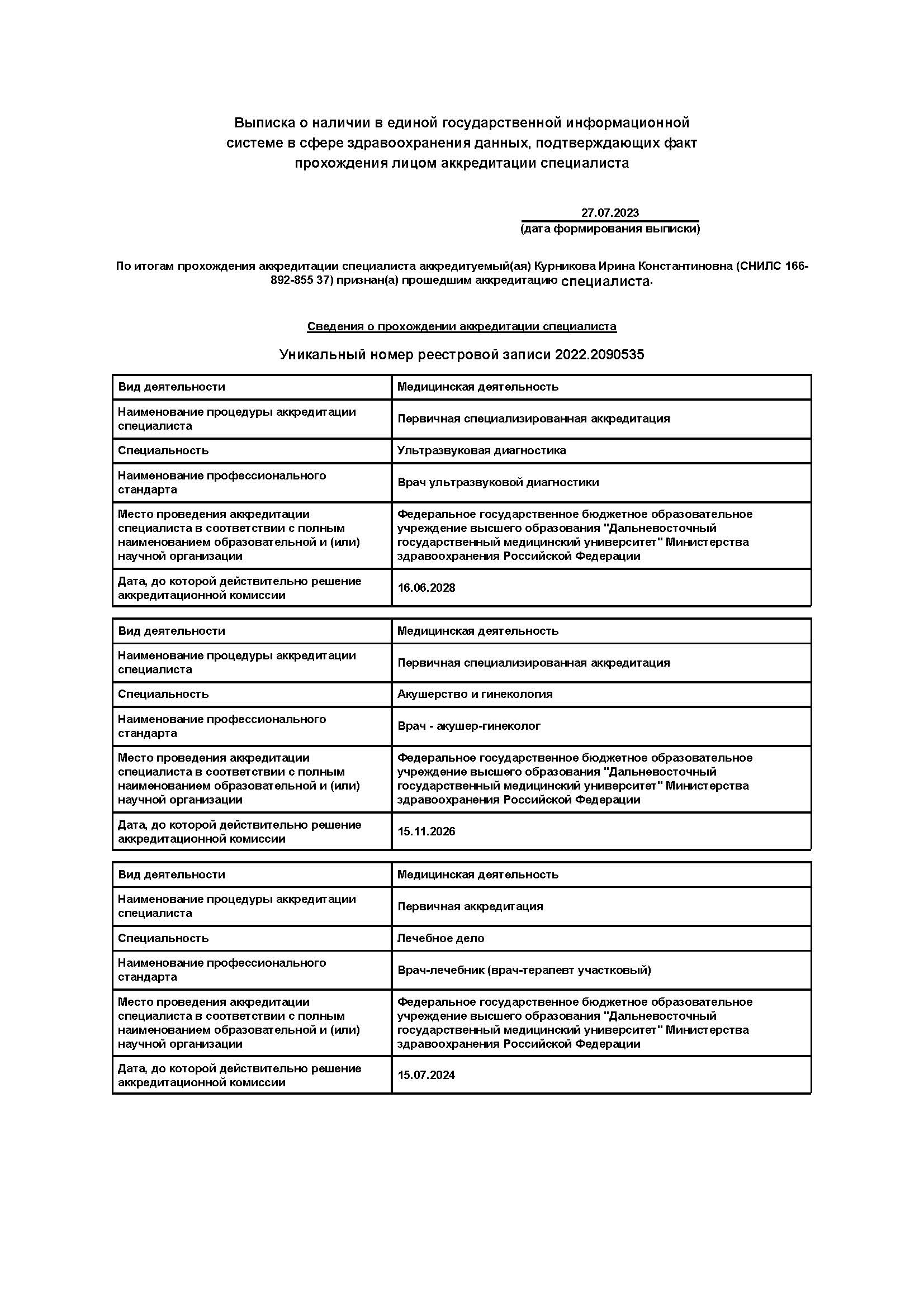 Акушерство и гинекология. Первичная специализированная аккредитация. Действует с 15.11.2021 по 15.11.2026г.