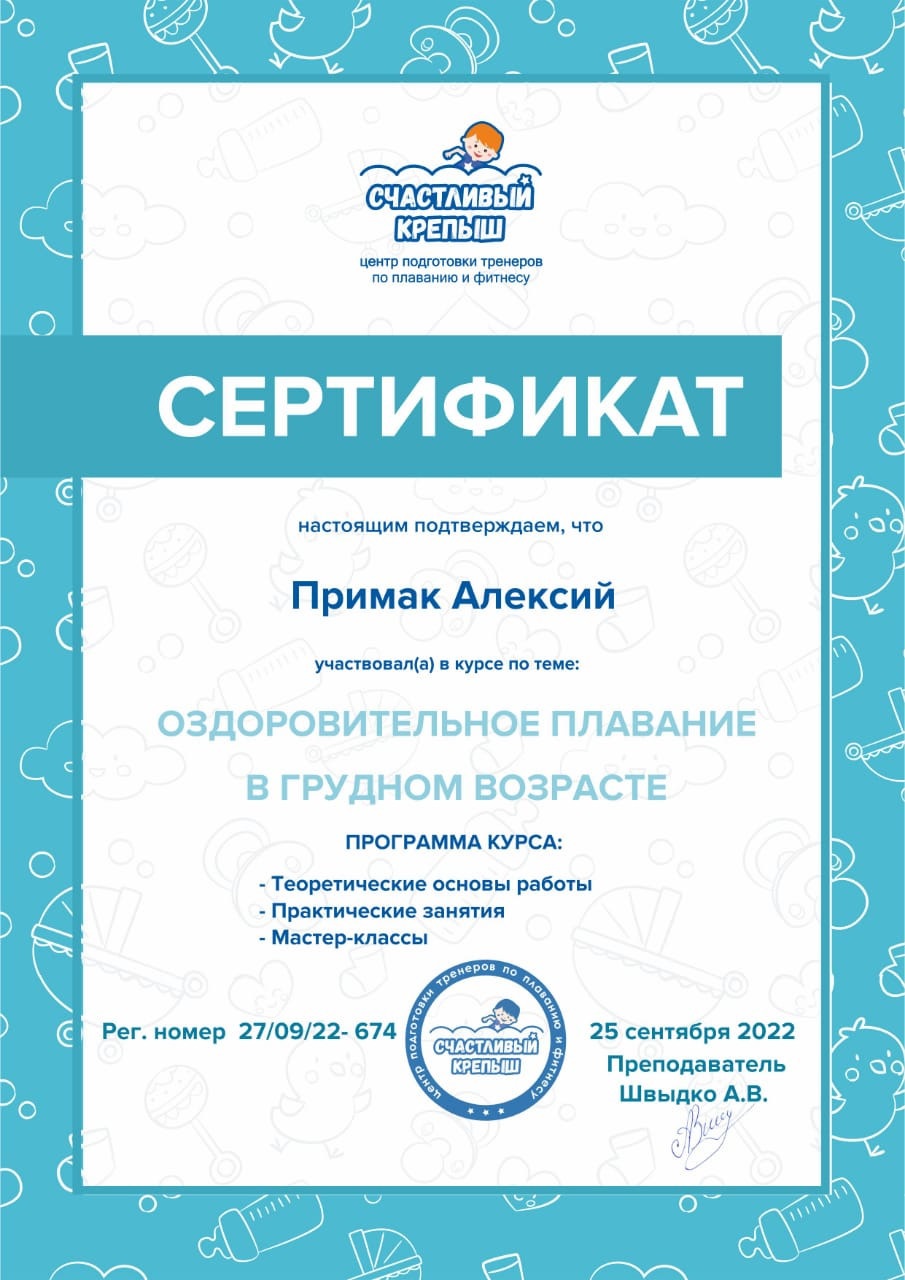 Повышение квалификации Центр подготовки тренеров по плаванию и фитнесу "Счастливый крепыш". "Оздоровительное плавание в грудном возрасте"